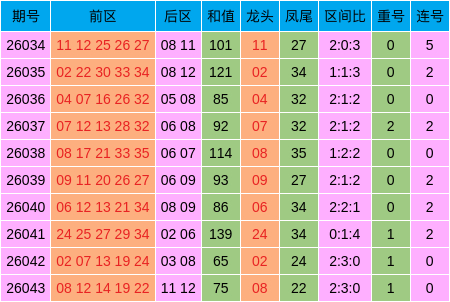 当期前区号码大小比为2:3,三区比为2:3:0,奇偶比为1:4,龙头开出08,凤尾开出22,开出1枚重号19,无连号。后区开出”奇偶“情势的号码11、12。 近10期轮廓特征图(大乐透第26044期三分区领略)
